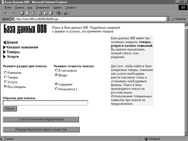 Начальный файл базы Db008.asp - содержит форму для ввода параметров поиска. Здесь пользователь может выбрать интересующий его раздел или просто задать слово для контекстного поиска, так же выбрав разделы где искать.