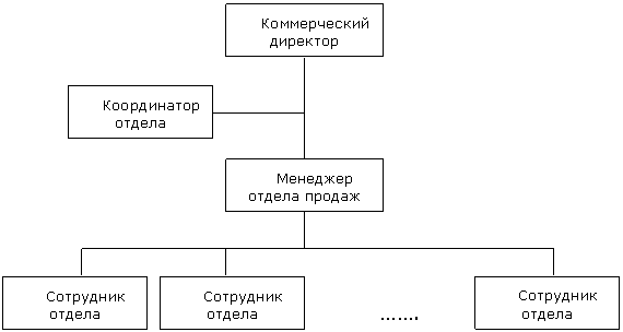 Функции, выполняемые информационной системой, во многом будут зависеть от ролей пользователей, использующих данные, хранящиеся в инфосистеме. Роли определяются позицией, занимаемой пользователем в структуре коммерческого отдела компании Вэб Плас. Ниже приведена структурная схема части коммерческого отдела, которая будет использовать базу данных.