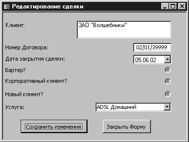 Для редактирования сделок нужно в главном меню выбрать пункт «Сделки» и в предлагаемом списке нажать на «Редактировать». В итоге пользователю будет выведена форма «ChangeDeal» для редактирования информации о выбранной сделке (рисунок 13).