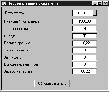 Сотрудник отдела продаж имеет возможность просмотреть свои показатели за любой, определенный им месяц. Форма «CommissionSales» реализует эту возможность (рисунок 14). Для просмотра показателей необходимо выбрать любую дату из желаемого месяца в поле «Дата отчета» и нажать кнопку «Обновить данные».