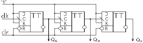 Самыми простыми двоичными счётчиками являются асинхронные двоичные счётчики(АДС).Пусть к=3, тогда АДС с М=2^3 будет выглядеть: