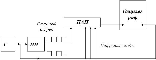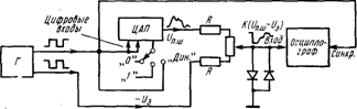 На рисунке 2 показана схема устройства контроля времени установления ЦАП при кодовой комбинации главного переноса. Все разряды ЦАП, кроме старшего, возбуждаются параллельно с помощью генератора Г прямоугольных импульсов. Этот же сигнал после инвертора Ин подается на старший разряд, вызывая его включение в момент выключения всех остальных разрядов. Выходной сигнал ЦАП при этом представляет собой прямоугольный сигнал с амплитудой Δ относительно уровня, равного половине полной шкалы. Выход ЦАП связан со входом осциллографа только по переменному току, и постоянная составляющая выходного сигнала ЦАП на вход осциллографа не поступает. Переходный процесс в этом случае можно наблюдать при большой чувствительности осциллографа по амплитуде.