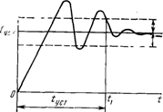 Анализ процесса начинают с участка заведомо установившегося переходного процесса, и анализируемую точку характеристики постепенно перемещают по временной оси к началу переходного процесса, т. е. справа налево (рисунок 4). Момент t1 превышения допустимого значения отклонения от установившегося уровня тока Iуст фиксируют дискриминатором уровня. Затем измеряют временной отрезок от начала исследуемого переходного процесса до зафиксированного дискриминатором момента времени, который и определяет время установления Iycт выходного сигнала ЦАП.