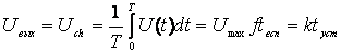 Поскольку моменты запуска и нормализации триггера Т2 определяются соответственно фронтом импульсов генератора Г, совпадающим с началом переходного процесса, и стробирующим импульсом, периодическое появление которого совпадает с моментом достижения переходным процессом установившегося значения, то длительность повторяющихся с частотой генератора выходных импульсов триггера Т2 в конце измерительного цикла равна длительности переходного процесса исследуемого сигнала (рисунок 6е). Длительность выходных импульсов триггера Т2 с помощью преобразователя средних значений ПСЗ преобразуется в пропорциональное напряжение постоянного тока, фиксируемое, по окончании измерительного процесса отсчетно-регистрирующим устройством ОРУ. Поскольку частота генератора фиксирована, При постоянстве амплитуды Umax импульсов триггера Т2 в качестве ПСЗ можно использовать преобразователь среднего значения импульсного сигнала в пропорциональное напряжение постоянного тока Ucp. В этом случае его выходное напряжение Uвых однозначно определяет длительность преобразуемых импульсов, а следовательно, длительность переходного процесса tycт, т. е.: