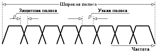 Широкая полоса пропускания канала делится на ряд узких полос, разделенных защитными полосами. Размеры узких полос могут быть различными.