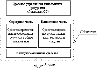 2. Средства предоставления собственных ресурсов и услуг в общее пользование – серверная часть ОС (сервер). Эти средства обеспечивают, например, блокировку файлов и записей, ведение справочников имен сетевых ресурсов; обработку запросов удаленного доступа к собственной файловой системе и базе данных; управление очередями запросов удаленных пользователей к своим периферийным устройствам.