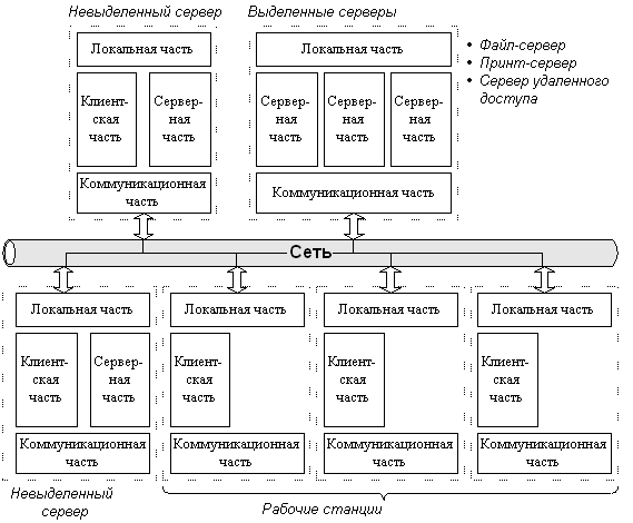 Если выполнение каких-либо серверных функций является основным назначением компьютера, то такой компьютер называется выделенным сервером. В зависимости от того, какой ресурс сервера является разделяемым, он называется файл–сервером, факс–сервером, принт–сервером, сервером приложений, сервером БД, Web–сервером и т. д. На выделенных серверах устанавливается ОС для выполнения тех или иных серверных функций. Выделенный сервер не принято использовать в качестве компьютера для выполнения текущих задач, не связанных с его основным назначением, так как это может уменьшить производительность его работы как сервера.