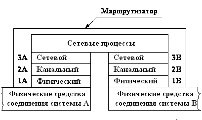 Каждый маршрутизатор реализует протоколы физического (1А, 1B), канального (2А, 2B) и сетевого (3A, 3B) уровней, как показано на рис.9.9. Специальные сетевые процессы соединяют части коммутатора в единое целое. Физический, канальный и сетевой протоколы в разных сетях различны. Поэтому соединение пар коммуникационных сетей осуществляется через маршрутизаторы, которые осуществляют необходимое преобразование указанных протоколов. Сетевые процессы выполняют взаимодействие соединяемых сетей.