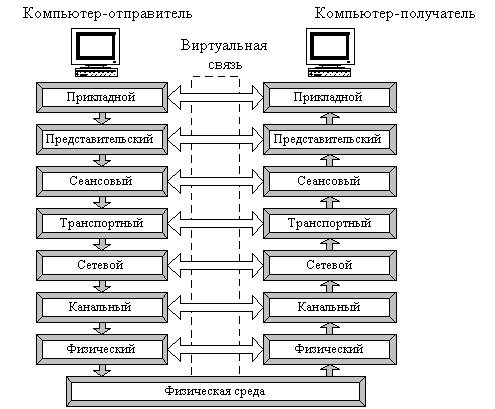 Каждый уровень компьютера–отправителя взаимодействует с таким же уровнем компьютера-получателя, как будто он связан напрямую. Такая связь называется логической или виртуальной связью. В действительности взаимодействие осуществляется между смежными уровнями одного компьютера.