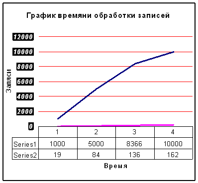 Тестирование программы проводилось на 4 массивах данных размером 1000, 5000, 8366, 10000 записей. Метод тестирования заключался в поиске последней записи массива по уникальному названию, чтобы определить время поиска по всему массиву. Полученные данные приведены в таблице и на основе данных построен график (см. график).