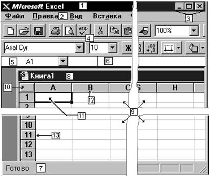 После запуска Excel на экране появляется рабочая книга Книга1, содержащая 16 рабочих листов. Каждый лист представляет собой таблицу, состоящую из строк и столбцов.