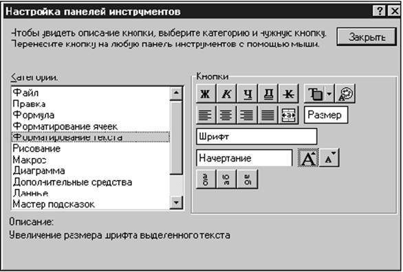 Встроенные панели Microsoft Excel уже содержат богатый набор кнопок инструментов. Имеется, однако, множество других кнопок, неиспользованных в начальной конфигурации встроенных панелей, но которые можно добавить на панели. Наконец, вы можете создать собственные кнопки инструментов и включить их в общий список. Для этого используется диалоговое окно Настройка (Вид | Панели инструментов . | Настройка .).