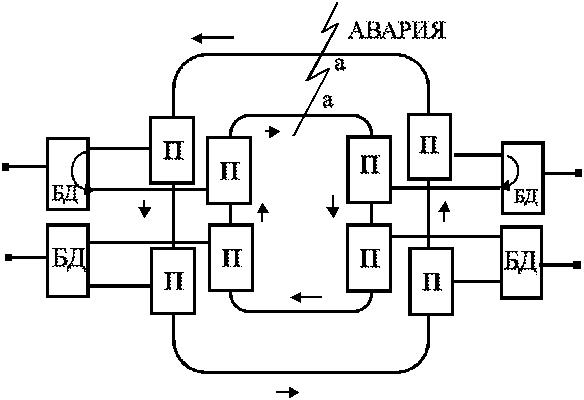 Например, при обрыве в точках “аа” АбС, расположенные рядом с точками разрыва, переходят в аварийный режим. В этом режиме, кроме выполнения своих функций, каждая из АбС замыкает друг с другом внешнее и внутреннее теперь уже полукольцо в одно единое кольцо.