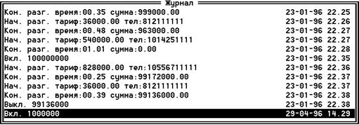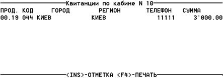 По просьбе клиента после выключения кабины можно распечатать квитанцию состоявшихся разговоров. Для этого нужно нажать клавишу F5 затем ввести номер кабины. Приблизительная форма квитанции изображена на рис. 4.3.