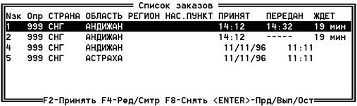 В нижней части рамки показан список возможных клавиш и их назначение. В списке отображается номер заказа, номер оператора принявшего заказ, название страны, название областного центра, название региона, название населенного пункта, время или дата принятия заказа в зависимости от типа заказа (текущий или уведомление), время ожидания абонентом разговора.