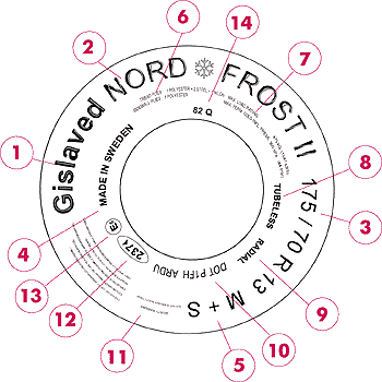 особенно когда предложение столь богато и разнообразно, как в хорошем брачном агентстве? На что обратить внимание в первую очередь? На известность "родителей", на внешние данные либо ухватиться за ее доступность? Желая хоть как-то облегчить муки выбора, мы попытались помочь сделать первый шаг в этом направлении (имея в виду, что это именно тот случай, когда при первом знакомстве самое пристальное внимание обращают на "одежку") и, взяв одну из самых популярных моделей прошедшей зимы - шину "Gislaved-Nord Frost II", на ее примере попробовали рассказать, какую же информацию несет на себе шина. 1. Торговая марка. 2. Модель шины (обозначение рисунка протектора). 3. 175/70 R13 - обозначение шины (см. рис.1).