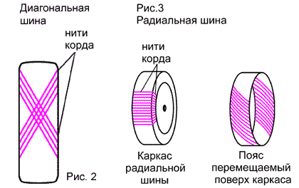 RADIAL - радиальная шина, DIAGONAL - диагональная (см. рис. 2, 3). Безопасность в отношении разрыва шины зависит, в первую очередь, от прочности каркаса. Для диагональных шин давление разрыва P>2 МПа, радиальных - не менее 2.5 МПа (эта величина значительно выше давления воздуха при эксплуатации, составляющего 0.2 МПа). Радиальная шина в большей мере удовлетворяет требованиям безопасности. Преимущества радиальных шин - меньший износ и меньшее сопротивление качению (и то и другое достигается за счет стабилизирующего действия пояса). На диагональных шинах в процессе контакта с дорогой изменяется направление скрещенных слоев, следствием чего является повышенное теплообразование в плоскости контакта, приводящее к износу и потерям на качение. К преимуществам радиальной шины необходимо добавить: