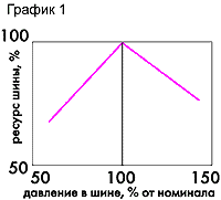 5. Кроме того, если на шине присутствует надпись "DA", то это означает, что данная шина имеет второстепенные дефекты, и она может быть установлена на прицеп либо на автомобиль, но с ограничением скорости до 100 км/ч. Из информации, не указываемой на шине, но также представляющей определенный интерес, стоит отметить необходимость поддержания требуемого давления в шине. Если пробег шины при правильном давлении принять за 100%, то при понижении давления на 20% ее ресурс составит около 85%, при снижении на 40% - около 60%, при снижении на 60% - около 25%. Причина - в повышенном нагреве и неблагоприятной форме пятна контакта. Аналогично увеличивается износ и при повышенном давлении в шине, однако, уже не по крайним дорожкам, а в средней зоне беговой поверхности. На графике 1 показано обусловленное неправильным давлением уменьшение пробега шины.