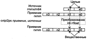 CVTPI2PS (Conversion Two Packed signed Int32 to Packed Single-precision float-point) — преобразование двух упакованных 32-битных целых в два упакованных вещественных значения.