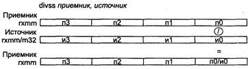 DIVSS (DIVide Scalar Single-precision float-point) — скалярное деление значений в формате ХММ согласно следующей схеме.
