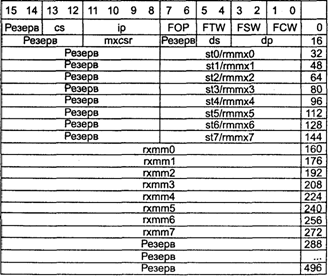 FXRSTOR (ReSTORe Fp and mmX state and streaming simd extension state) — восстановление без проверки наличия незамаскированных исключений с плавающей точкой состояния сопроцессора, целочисленного и потокового MMX-расширений из 512-байтной области памяти (см. рисунок ниже).