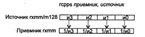 Действие: команда перераспределяет любые два из четырех двойных слов приемника в два младших двойных слова того же приемника и любые два из четырех двойных слов источника в два старших двойных слова приемника. Если использовать один и тот же регистр ХММ в качестве источника и приемника, то можно выполнять любые перестановки в пределах одного регистра. Каждая пара бит маски определяет номер двойного слова источника или приемника, которое будет перемещено в приемник следующим образом:
