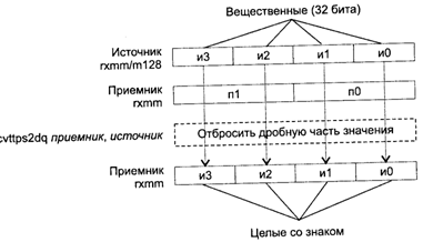 CVTTPS2DQ (ConVerT with Truncation Packed Single-precision floating-point values to packed Doubleword integers) — преобразование (путем отбрасывания дробной части) четырех упакованных значений с плавающей точкой одинарной точности в четыре упакованных 32-битных целых со знаком.