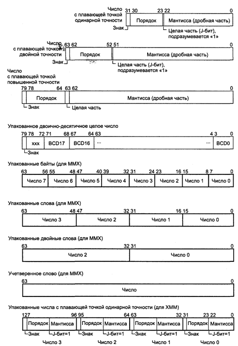 Рис. 2. Типы данных, обрабатываемых блоками FPU/MMX и ХММ