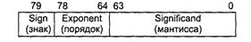 Сопроцессор оперирует данными в формате с плавающей точкой, который позволяет представлять существенно больше действительных чисел, чем целочисленное АЛУ центрального процессора. Арифметические операции (здесь под арифметическими понимаются операции, изменяющие значения операндов, а также операции сравнения) в FPU выполняются над 80-битными числами, преде га пленными во внутреннем формате расширенной точности (рис. 3). Формат позволяет представлять следующие категории чисел: