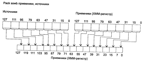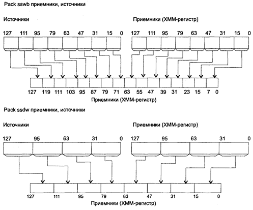 PACKSSWB (Pack with Signed Saturation Words to Bytes) — упаковка со знаковым насыщением слов в байты. PACKSSDW (Pack with Signed Saturation Double Words to Words) — упаковка со знаковым насыщением двойных слов в слова.