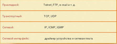 · Уровень сетевого интерфейса отвечает за установление сетевого соединения в конкретной физической сети - компоненте internet, к которой подсоединен компьютер. На этом уровне работают драйвер устройства в операционной системе и соответствующая сетевая плата компьютера.