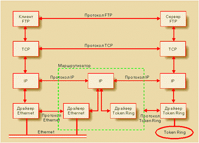 На рисунке 3 показано, как осуществляется соединение двух сетей "с точки зрения" TCP/IP. Программное обеспечение IP-протокола с помощью маршрутизатора передает пакеты из сети Ethernet в сеть Token Ring. Протоколы верхних уровней, прикладного и транспортного, осуществляют соединения между хост-компьютерами, клиентом и сервером приложения, в то время как IP обеспечивает связь между конечной и