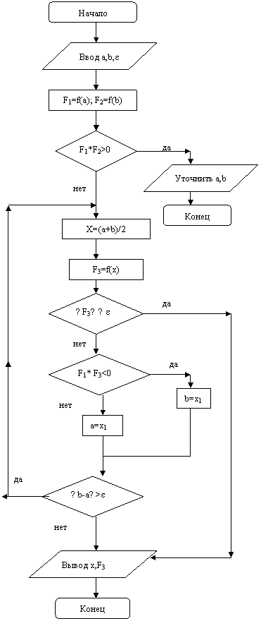 4) Вычислим разность a и b, сравним ее с точностью ε: если |a-b|> ε, то идем в пункт 1) если нет, то корень с нужной нам точностью найден, и он равен: x=(a+b)/2;