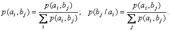 Для полного и всестороннего описания канала связи необходимо задать: канальную матрицу вида !!!!!! и безусловные вероятности вида !!!! или канальную матрицу вида !!!!!! и безусловные вероятности вида !!!!!. В последнем случае сумма значений матрицы по столбцам дает безусловные вероятности вида !!!!!!!!!!, а сумма по строкам дает безусловные вероятности вида !!!!!!. Условные вероятности могут быть найденными из выражений: