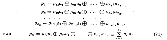 комбинаций искомого кода. Остальные комбинации кода строятся при помощи образующей матрицы по следующему правилу: корректирующие символы, предназначенные для обнаружения или исправления ошибки в информационной части кода, находятся путем суммирования по модулю 2 тех строк матрицы П, номера которых совпадают с номерами разрядов, содержащих единицы в кодовом векторе, представляющем информационную часть кода. Полученную комбинацию приписывают справа к информационной части кода и получают вектор полного корректирующего кода. Аналогичную процедуру проделывают со второй, третьей и последующими информационными кодовыми комбинациями, пока не будет построен корректирующий код для передачи всех символов первичного алфавита.