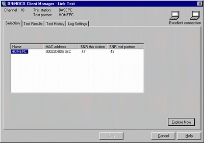 Сначала можно выбрать партнера для теста из доступных станций. На закладке "Test Results" можно посмотреть текущие характеристики канала связи, причем параметры оцениваются с обеих сторон канала. Там же можно посмотреть, на каких скоростях происходит обмен информацией. Закладка "Test History" показывает динамику изменения параметров связи. С помощью закладки "Log Settings" можно настроить запись характеристик канала в файл. С использованием этой программы было проведено исследование дальности связи и факторов, которые на нее влияют. У установленных на расстоянии 3м ПК отношение SNR (сигнал/шум) составляет примерно 45db. Снижение этого параметра (кроме расстояния) вызывает помещение на линии связи различных преград. Например, железный лист (от корпуса ПК) -9db, железобетонная стена -6db, рука - 5db (конечно, эти цифры очень приблизительные). Карты автоматически выбирают скорость работы из 11, 5.5, 2, 1Mbit/s, исходя из условий связи. Связь на скорости 11Mbit/s возможна до SNR примерно 15db. Мы проводили тестирование на пересеченной местности, в парке, при этом расстояние устойчивой работы на максимальной скорости достигало 100м. На расстоянии 120м при SNR примерно 10db, пакеты приходили на скоростях 11/5.5/2/1Mbit/s в соотношении 0% / 66% / 33% / 0%. Увеличение расстояния до 180м, привело к падению SNR до 7db, а соотношение скоростей стало 0% / 0% / 50% / 50%. В нашем случае ограничивающим фактором являлись преграды в виде деревьев, мелкий дождь, ну и возможно влияние Останкинской телебашни (она была на расстоянии порядка 800м). Проблемы с качеством связи также могут вызывать микроволновые печи, охранные системы, радиотелефоны. Исходя из результатов тестирования, можно сказать, что параметры мощности передатчика и чувствительности приемника отличные, и в хороших условиях вполне достижимы заявленные дальности работы. Кстати, у встроенных в PC Card антенн нет ярко выраженной направленности. При перемещении ноутбука вокруг настольного ПК заметных изменений качества приема не отмечалось. На больших дальностях влияние положения антенны также практически не заметно. Можно сказать, что при расположении антенн в направлении друг к другу качество немного (SNR на 4 5db) выше. Использование оборудования в офисной/домашней обстановке заметно снижает радиус устойчивой работы из-за стен, а максимальная дальность может быть достигнута только в условиях установки антенн на открытом пространстве.