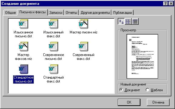 1. Пользуясь встроенным шаблоном, создайте стандартное письмо. Для этого в меню Файл щелкните по команде Создать, в появившемся окне выберите закладку Письма и факсы, а в ней – значок Стандартное письмо и ОК.