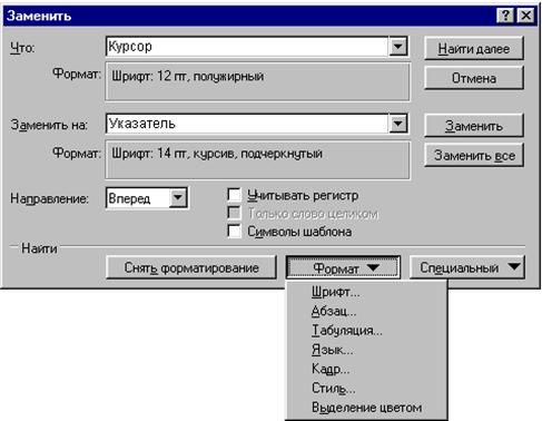 Удалить весь текст в поле Что, нажать кнопку Формат. Появится список форматов, задать необходимые форматы. |