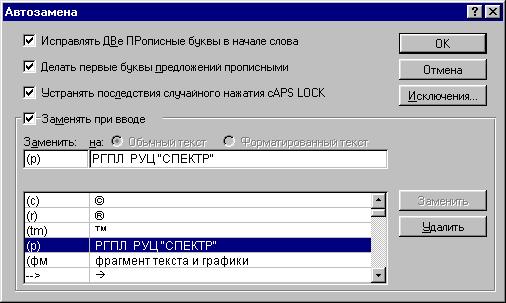 Можно добавлять элементы автозамены в процессе проверки орфографии. Для этого в диалоге Орфография из меню Сервис следует использовать кнопку Автозамена.