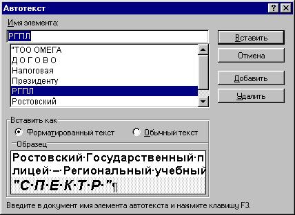 Чтобы вставить элемент Автотекста в текст, наберите его имя и нажмите кнопку Автотекст (или кнопку F3). Если Вы не помните имя нужного фрагмента, можно щелкнуть по команде Автотекст в меню Правка и выбрать элемент Автотекста из списка всех существующих элементов.