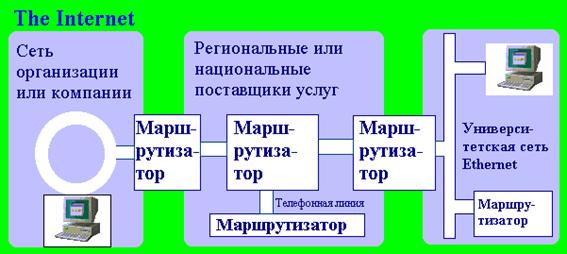 Различные участки Internet связываются с помощью системы компьютеров (называемых маршрутизаторами) соединяющих между собой сети. Это могут быть сети Internet, сети с маркерным доступом, телефонные линии (см. рис.2).
