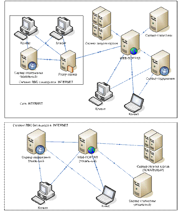 Выбрано WEB-решение в связи с тем, что это позволит использовать СДО в сети INTERNET и локальной вычислительной сети, обеспечит универсальность. Варианты эксплуатации «Системы Дистанционного Обучения» представлены на рисунке: