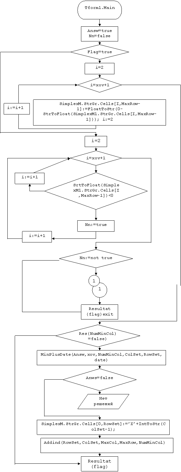 -procedureMinPlusDate – отыскание положительных коэффициентов в главном столбце и наименьшего частного при делении базисных неизвестных на коэффициенты в главном столбце