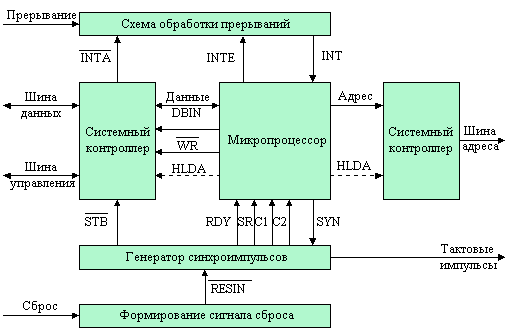 , стробирующий слово состояния микропроцессора. Кроме того, в БИС размещены схемы, обеспечивающие синхронизацию выдачи в микропроцессор сигналов сброса и готовности.