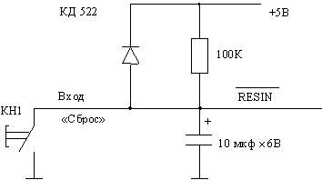 Формирователь сигнала сброса (рис.1.5) служит для начальной установки МПС при включении питания или при нажатии кнопки КН1. Время заряда конденсатора через резистор определяет длительность формируемого импульса. Диод служит для быстрой разрядки конденсатора при кратковременном отключении питания.
