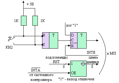 Для осуществления прерываний в МПМ могут использоваться различные аппаратные средства, в частности в схеме, показанной на рис.1.8. Первый триггер служит для предотвращения "дребезга" контактов кнопки КН2, второй – для выдачи запроса на прерывание в микропроцессор. После поступления от микропроцессора подтверждения запроса на прерывание на шину данных микропроцессора подается код команды RST, соответствующей реализуемому уровню прерывания.