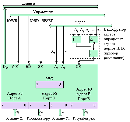 Адресный дешифратор задает базовый адрес ППА, а входы А0 и А1 ППА определяют номер его внутреннего регистра. Управляющее слово, загруженное в регистр управляющего слова (РУС), настраивает порты ППА на указанный режим и направление передачи.