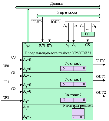 Модуль таймера предназначен для отсчета временных интервалов при выработке сигналов y2 и y3. Модуль таймера реализован на базе БИС программируемого таймера (ПТ) КР580ВИ53. Интерфейс кристалла ПТ и формат его управляющего слова показаны соответственно на рис.1.11 и 1.12.