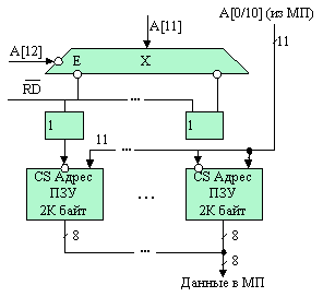 Разработка памяти МПС должна начинаться с определения ее емкости, требуемой для размещения программ (ПЗУ) и переменных (ОЗУ). Разрядность памяти соответствует разрядности микропроцессора и равна байту. Техническим заданием на курсовой проект определены конкретные типы ИС ОЗУ и ПЗУ. Если для реализации необходимого объема памяти оказывается недостаточно одной ИС ЗУ, потребуется модульная структура на основе нескольких банков памяти, выбираемых адресным дешифратором (рис.1.13).