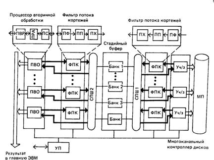 На уровне вторичной обработки применяются процессоры вторичной обработки (ПВО) и ФПК. Назначение ФПК - выполнять описанную выше обработку кортежей результирующих отношений, поступающих из ПВО в СЕЛ. ПВО содержит наряду с процессором реляционной алгебры (ПРА), реализованным на основе универсального микропроцессора со своей локальной памятью, также аппаратный процессор сортировки отношений (ПСО) и процессор выдачи результата (ПВР) в канал главной ЭВМ. ПСО осуществляет потоковую сортировку сегмента отношения, поступающего из банка СЕЛ в процессор реляционной алгебры. Двухпортовые банки СЕЛ подсоединяются к процессорам обработки обоих уровней посредством специальных петлевых шин (СПШ). Эти многоканальные шины с разделением времени осуществляют на каждом уровне обработки коммутацию любого процессора обработки к любому банку памяти и одновременную обработку нескольких банков памяти.